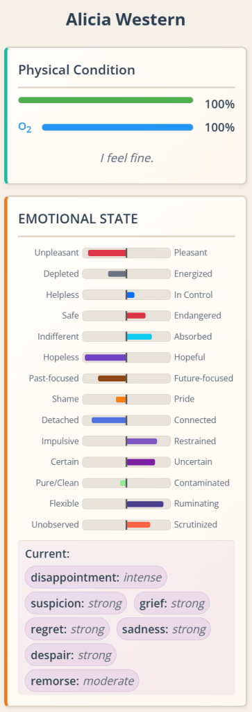 Anyway, I guess at some point I’ll run my good ol’ test scenario involving Alicia, with her now showing far more emotion than she used to before I implemented this system. That’s a win in my book.
