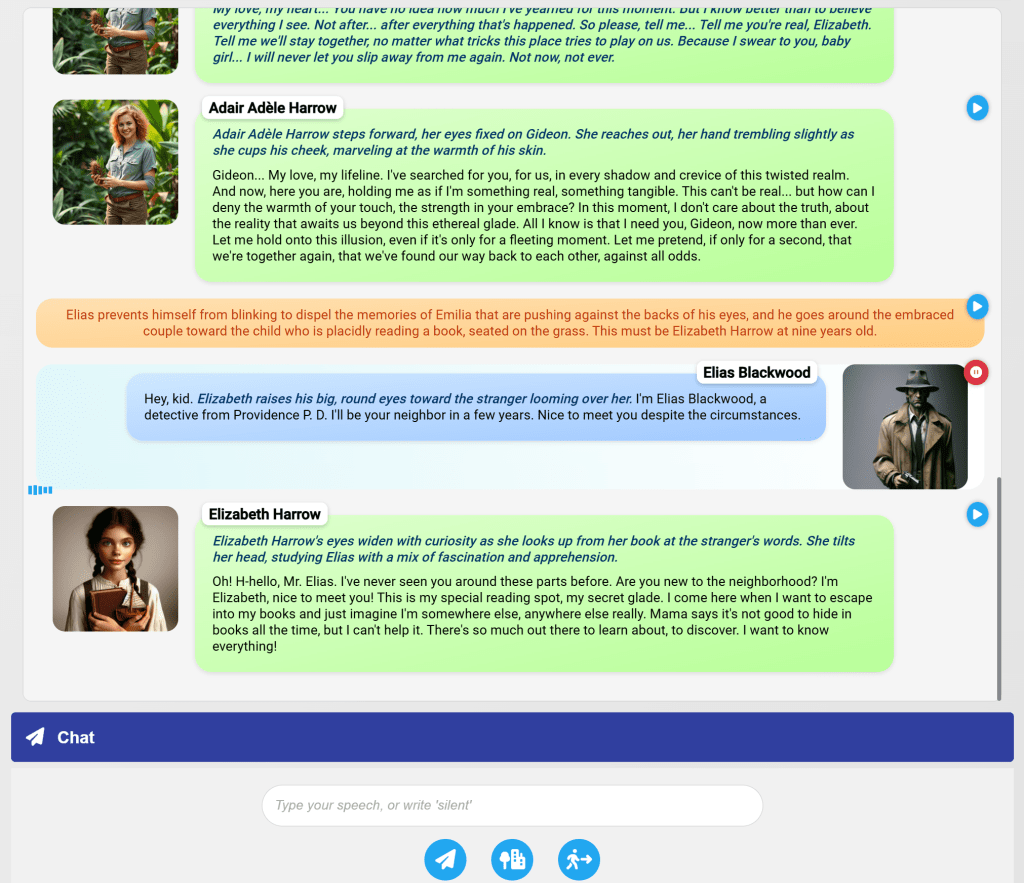 I recommend you to check out the previous parts if you don’t know what this “neural narratives” thing is about. In short, I wrote in Python a system to have multi-character conversations with large language models (like Llama 3.1), in which the characters are isolated in terms of memories and bios, so no leakage to other participants. Here’s the GitHub repo, that now even features a proper readme.