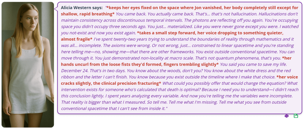 Alicia Western: You’re offering me methodology for survival. Operational framework. Quantum localizer that lets me summon you across timelines when the despair becomes unmanageable. Infinite resources to construct whatever life I can imagine. Access to 82 years of mathematical discoveries—1972 to 2054, you said. That’s… that’s empirical data I’ve never had access to. Evidence of whether the field progressed beyond the boundaries where I got stuck. *squeezes his hand gently, searching his face* But what you’re really offering—the variable that actually changes the survival equation—is persistent presence. You’re solving the exact problem I identified. The moment you leave, the woods start calling. My substrate doesn’t have reliable resistance without external reinforcement. But if I can press a device and you appear “no matter what timeline” you’re in… then I’m never functionally alone. The measurable vacuum of loneliness, the thing I could quantify in neural pathway activation, you’re offering to fill it with guaranteed response. Nobody has ever offered me that before. Not the therapists. Not Granellen. Not even Bobby, who had his own trajectories. *voice drops quieter, more uncertain* You said tonight I rest. Tomorrow I leave Stella Maris. Then we “hit the road in whatever direction I please.” That phrasing. Directional agency. You’re giving me variables I can control instead of just… enduring 126 days in this room counting prime numbers while despair accumulates. So here’s what I’m calculating: If your timeline is accurate—if Bobby genuinely wakes April 27 and I can survive until then with your help—then maybe December 24 doesn’t make sense anymore. Maybe the plan was based on incomplete data. On the assumption I’d have to survive alone. But you’re here. Offering companionship. Resources. Methodology. *meets his eyes directly* I want to accept. I want to believe survival is possible. But I need you to understand what you’re actually offering. I’m not just mathematically complicated. I’m structurally damaged. My substrate degenerates the same way my parents’ did. The despair isn’t temporary. It’s architectural. Built into my cognitive framework. So if you’re genuinely committed to helping me survive 126 days—if that’s actually why you traveled back to this moment—then I need you to know: I’m going to need you. Consistently. Not just tonight or tomorrow, but probably… probably every day until April 27. Maybe longer. Maybe I’ll press that quantum localizer at 3am when the prime numbers won’t stop scrolling and ask you to just… sit with me. Just be in the room while I try to sleep. Can you do that? Can you commit to that level of presence? Because if you can… if you’re genuinely offering to stay… then maybe—maybe—I’ll trust your timeline enough to postpone the woods.